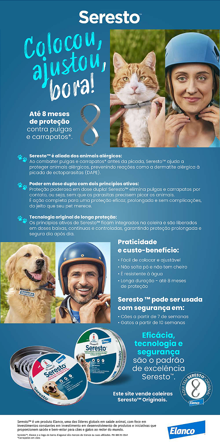 Seresto® oferece proteção contínua por até 8 meses: pulgas reinfestantes são eliminadas em até 2 horas e carrapatos reinfestantes são eliminados em até 6 horas.