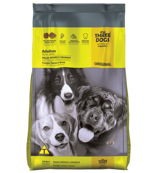 A ração Three Dogs Original frango, carne e arroz para cães adultos raças médias e grandes é um alimento seguro e moderno, sem aromatizantes e corantes artificiais que possui melhor custo benefício. Com uma receita rica em ingredientes de alta qualidade, que promovem o equilíbrio nutricional, palatabilidade superior e digestibilidade que o cães precisam para viverem saudável e feliz.