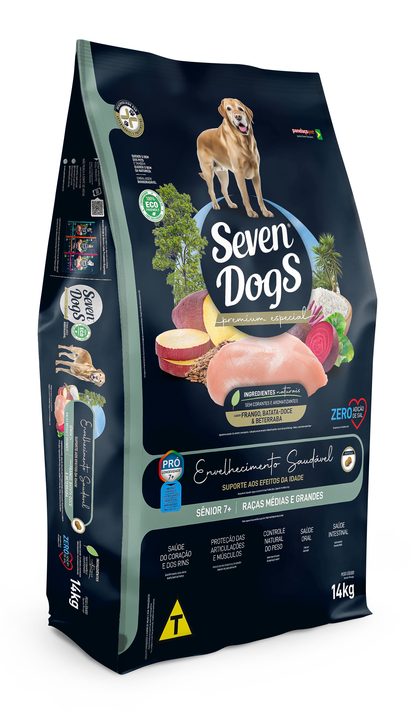 Cães idosos têm necessidades específicas e precisam de uma nutrição adequada para aumentar a longevidade com qualidade de vida. Seven Dogs Premium Especial reúne componentes indispensáveis à completa e equilibrada nutrição do seu cão nessa etapa da vida. É livre de corantes, aromatizantes e formulado com ingredientes de alta qualidade para uma melhor absorção dos nutrientes que proporcionam satisfação, energia e saúde ao seu melhor amigo. Nós queremos o melhor para o seu pet, porque #quererbemfazbem